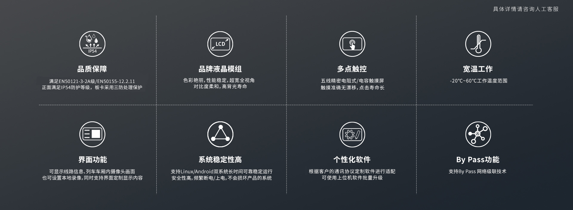 軌道交通系列是由軌道交通車載產品以及站臺產品組成的,精心打造的軌道交通產品系列,不僅深度融合了技術創新與人性化設計,更以穩定質量和廣泛的適應性,備受客戶的信賴,也為了軌道交通領域貢獻了一份力量。
